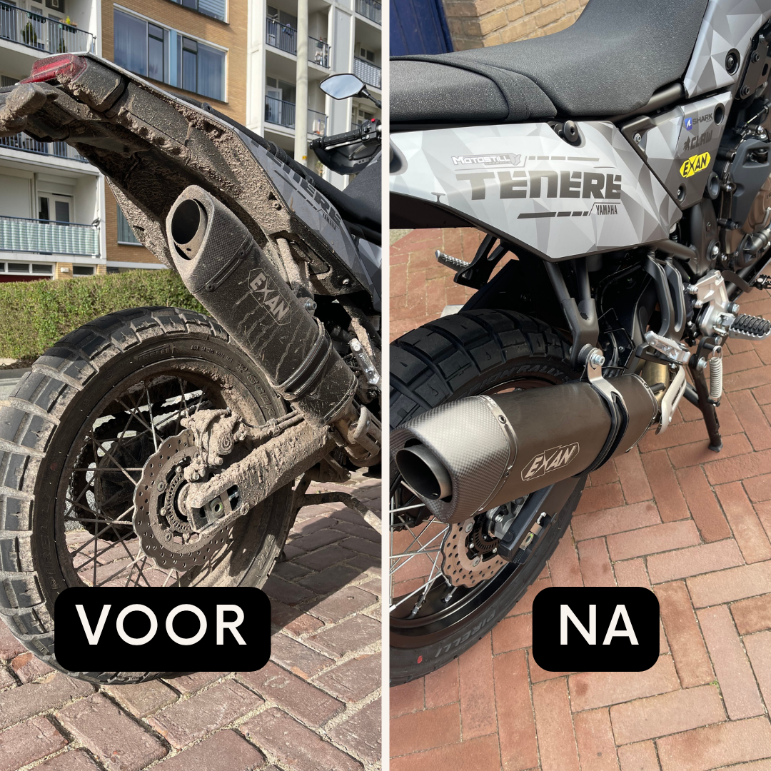 We hebben menig beursbezoeker en motorrijder zich laten verbazen met dit pakket. Want met dit pakket worden je uitlaat en uitlaatbochten weer echt schoon als nieuw!
