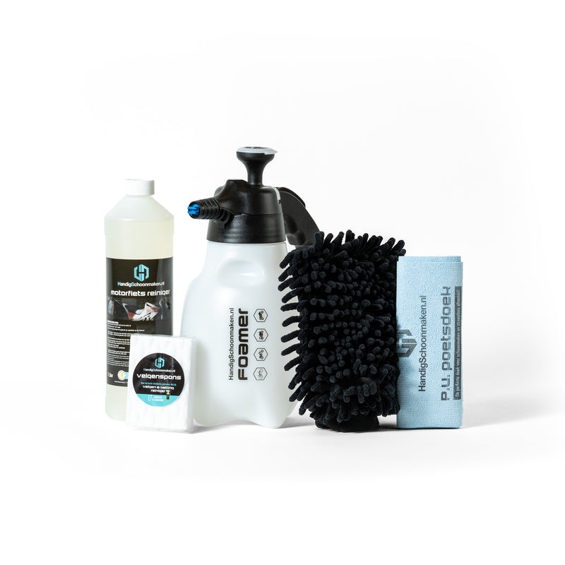 Let op! Dit pakket bevat geen producten voor je velgen en ketting. Daarvoor heb je het motorreiniger startpakket nodig.